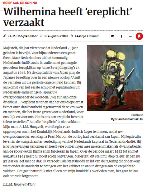Vandaag stond in de NRC de ingezonden brief aan de Koning van tante Loes. Zij hamert er terecht op dat Koningin Wilhelmina mooie woorden sprak maar dat niet is voldaan aan de ereplicht die Wilhelmina in 1946 uitspraak.